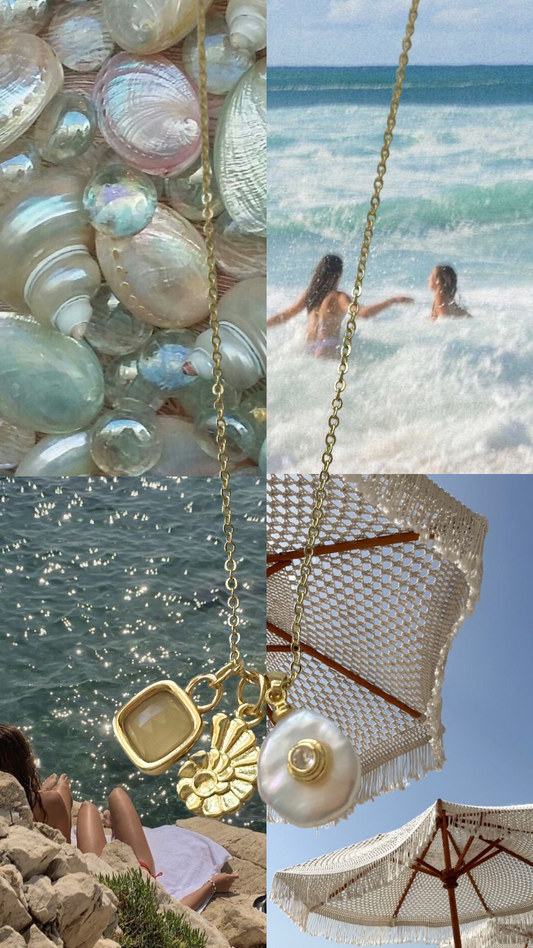 shell pearl aquamarine charm gold filled necklace